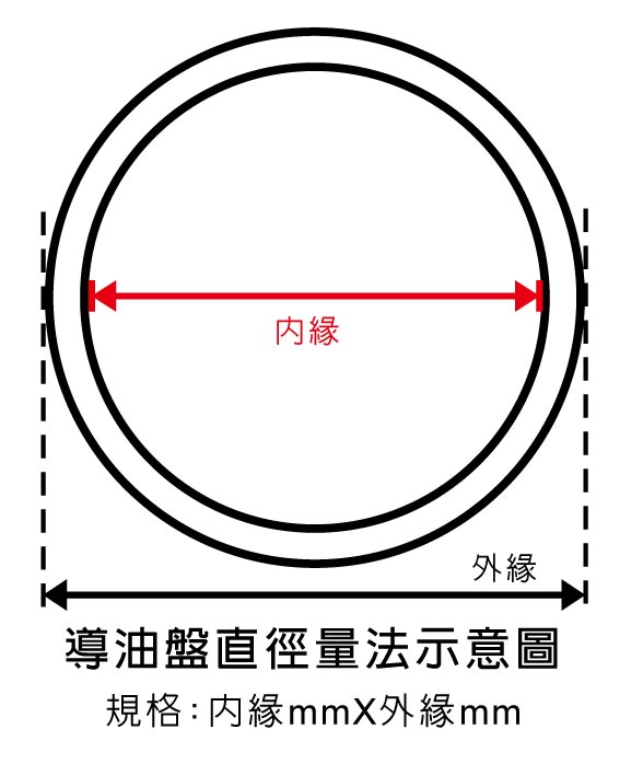 3.测量内缘时请以导油盘内缘左右最大宽度为基准(如图示)